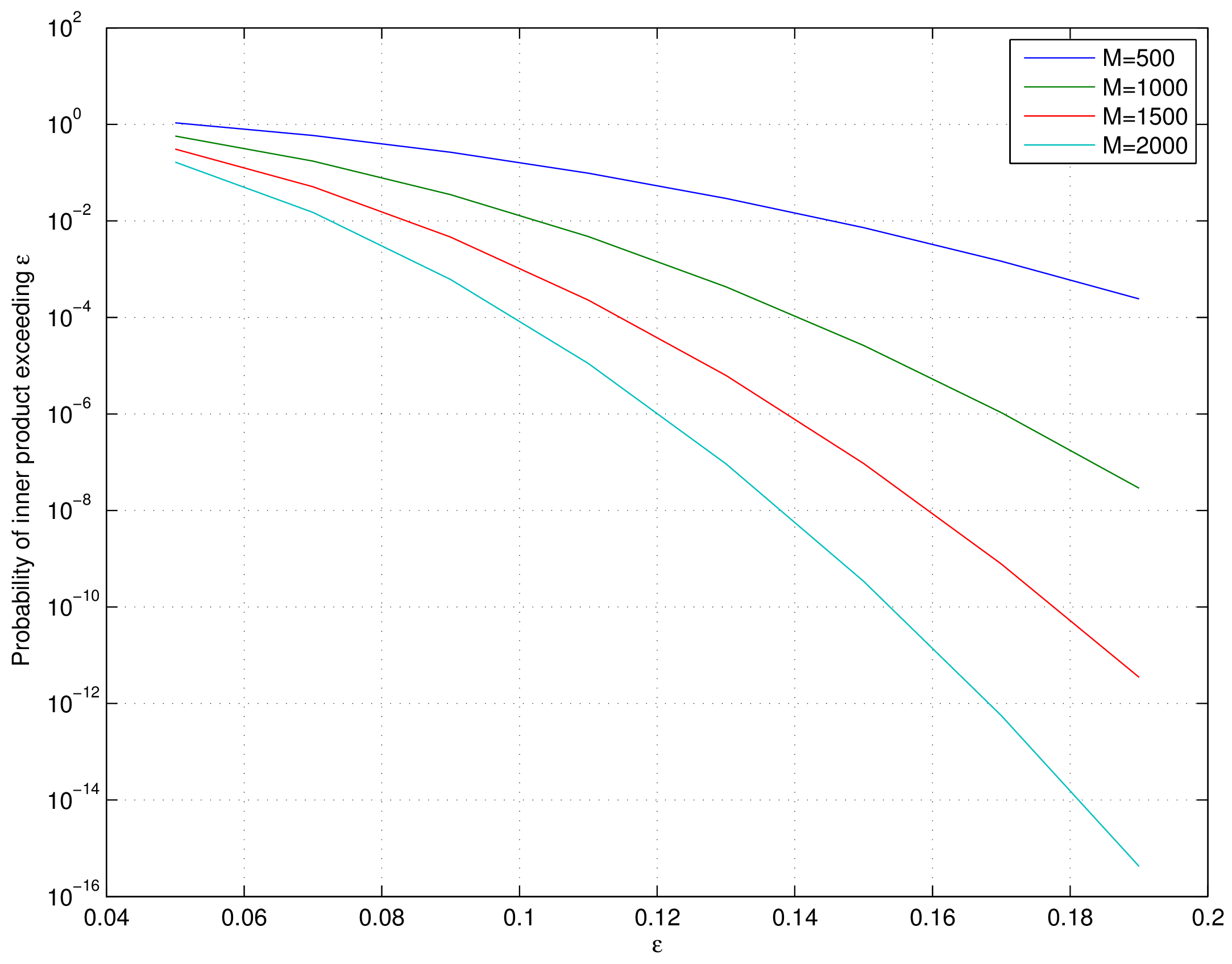 \[ \PP \left ( |\langle \phi_j, \phi_k \rangle | > \epsilon \right ) \leq 2 \exp \left (- \epsilon^2 \frac{M}{2} \right ). \]Now there are \(\frac{N(N-1)}{2}\) such pairs of \((j, k)\).